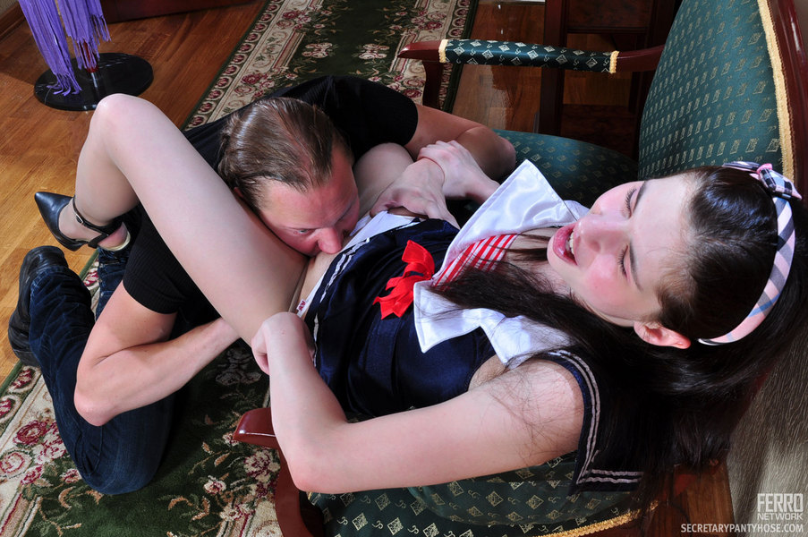 Clad in a cute uniform and sheer hose girl getting her nyloned box stuffed