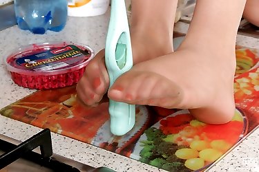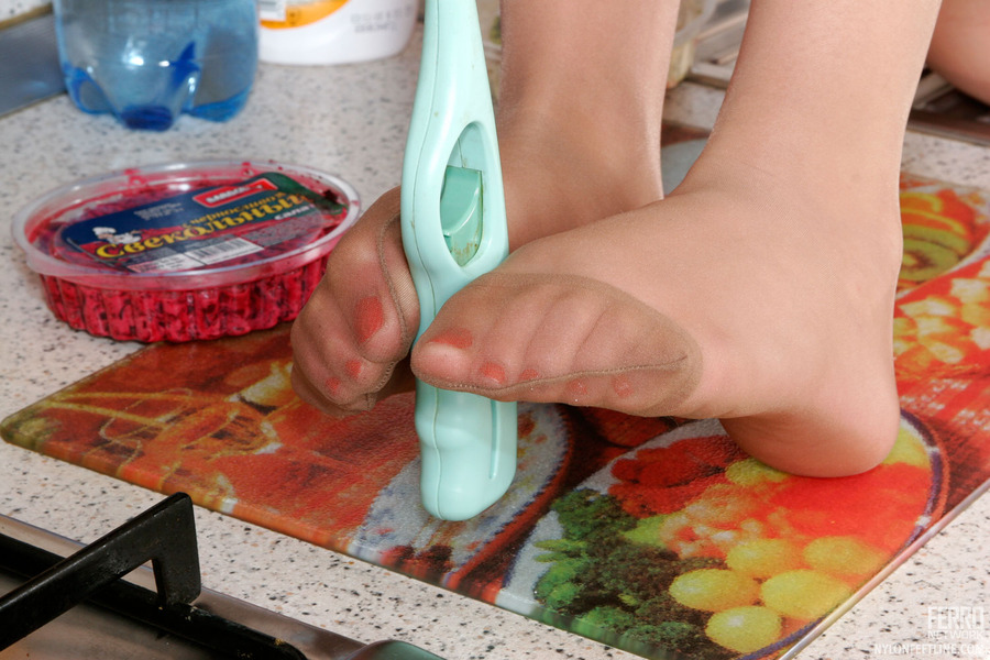 Nyloned feet are the best helper in the kitchen for long-legged brunette gal